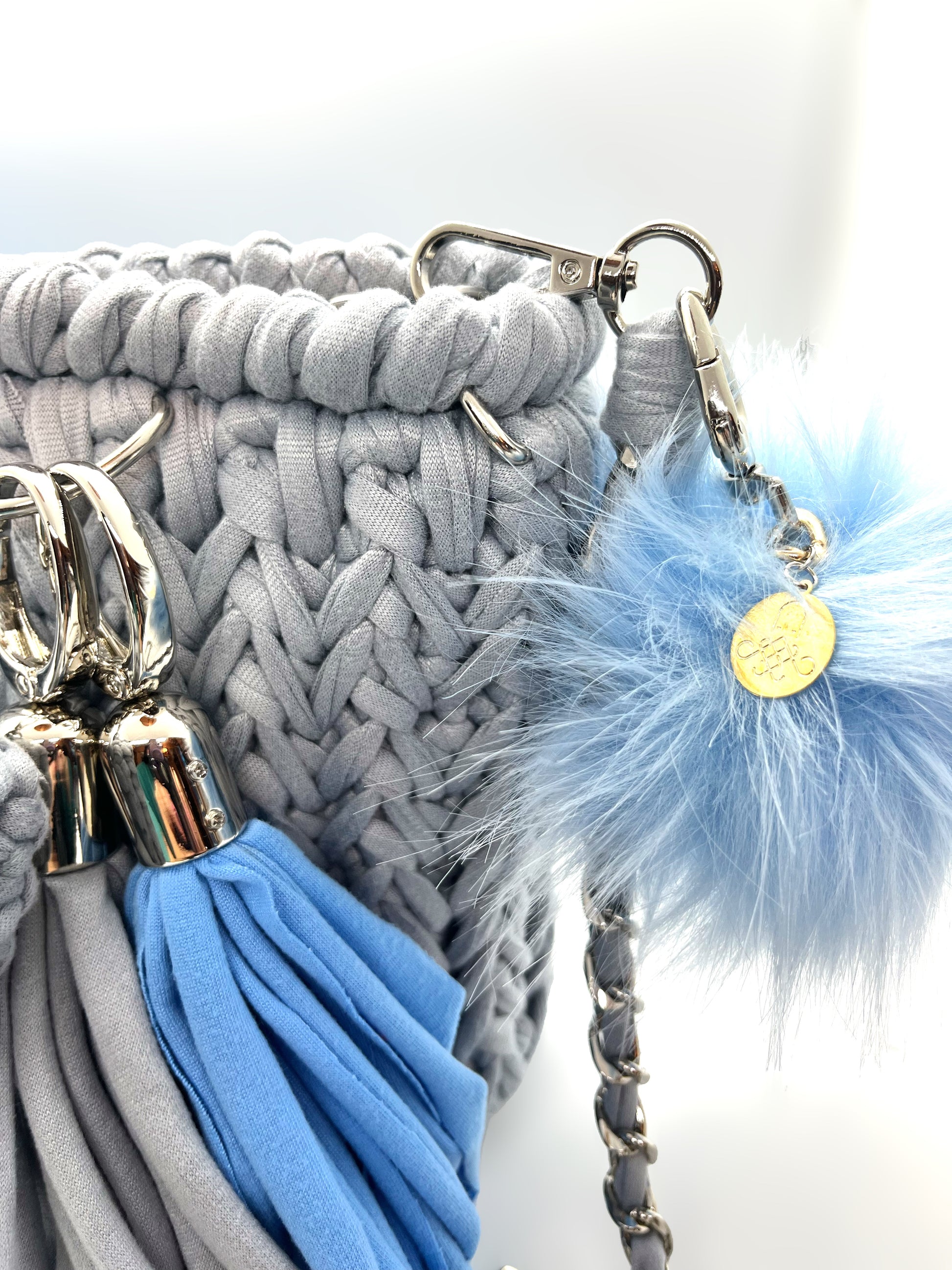 Cuenta con base de PU leather con patitas metálicas, un forro interior de algodón, y está equipada con un cierre de metal y corredora grabada a láser que enaltecen cada detalle. Las borlas con motero metálico le añaden carácter y movimiento, mientras que su pompón con dije bañado en chapa de oro de 18k le da ese brillo sutil que enamora.