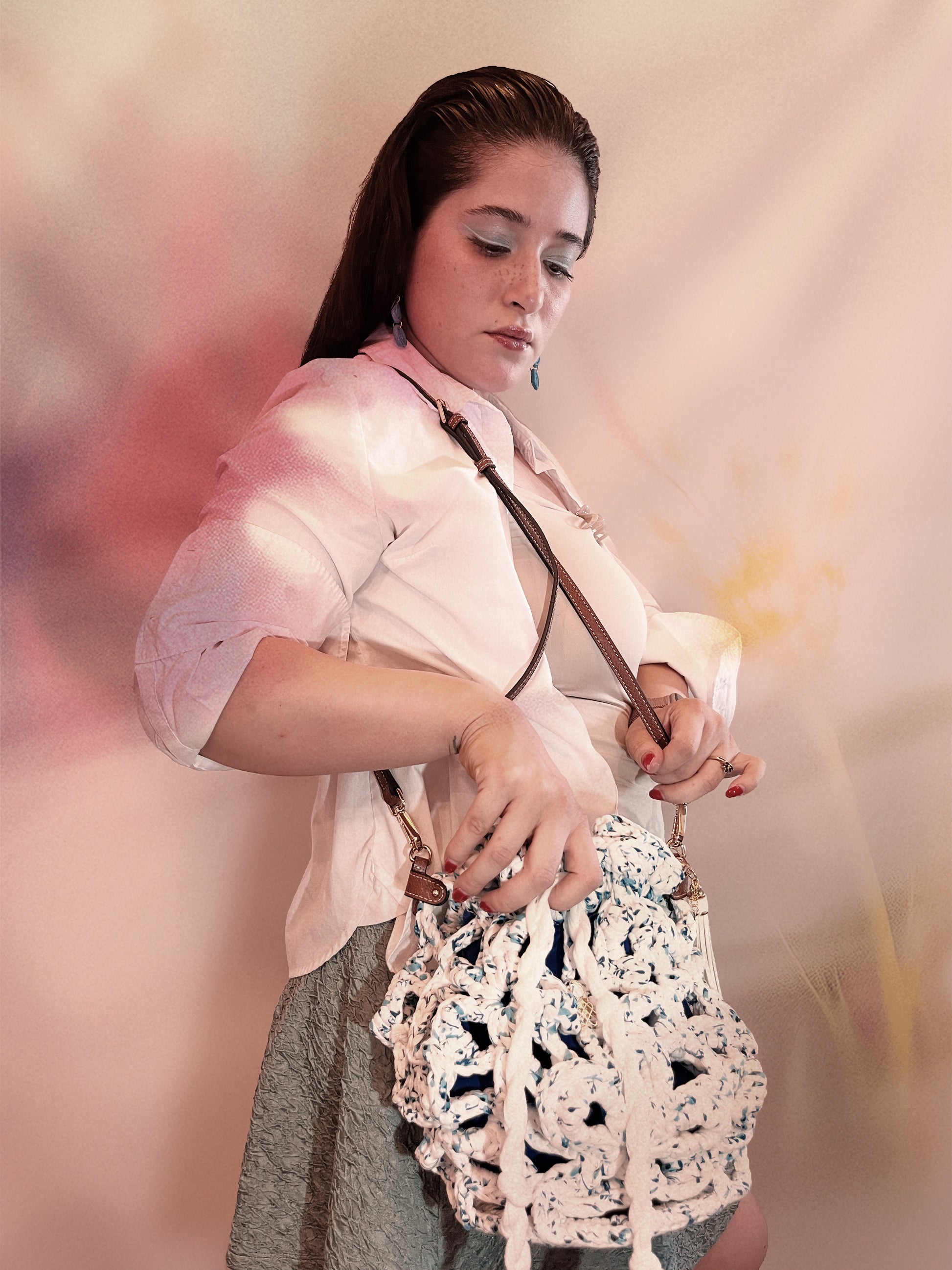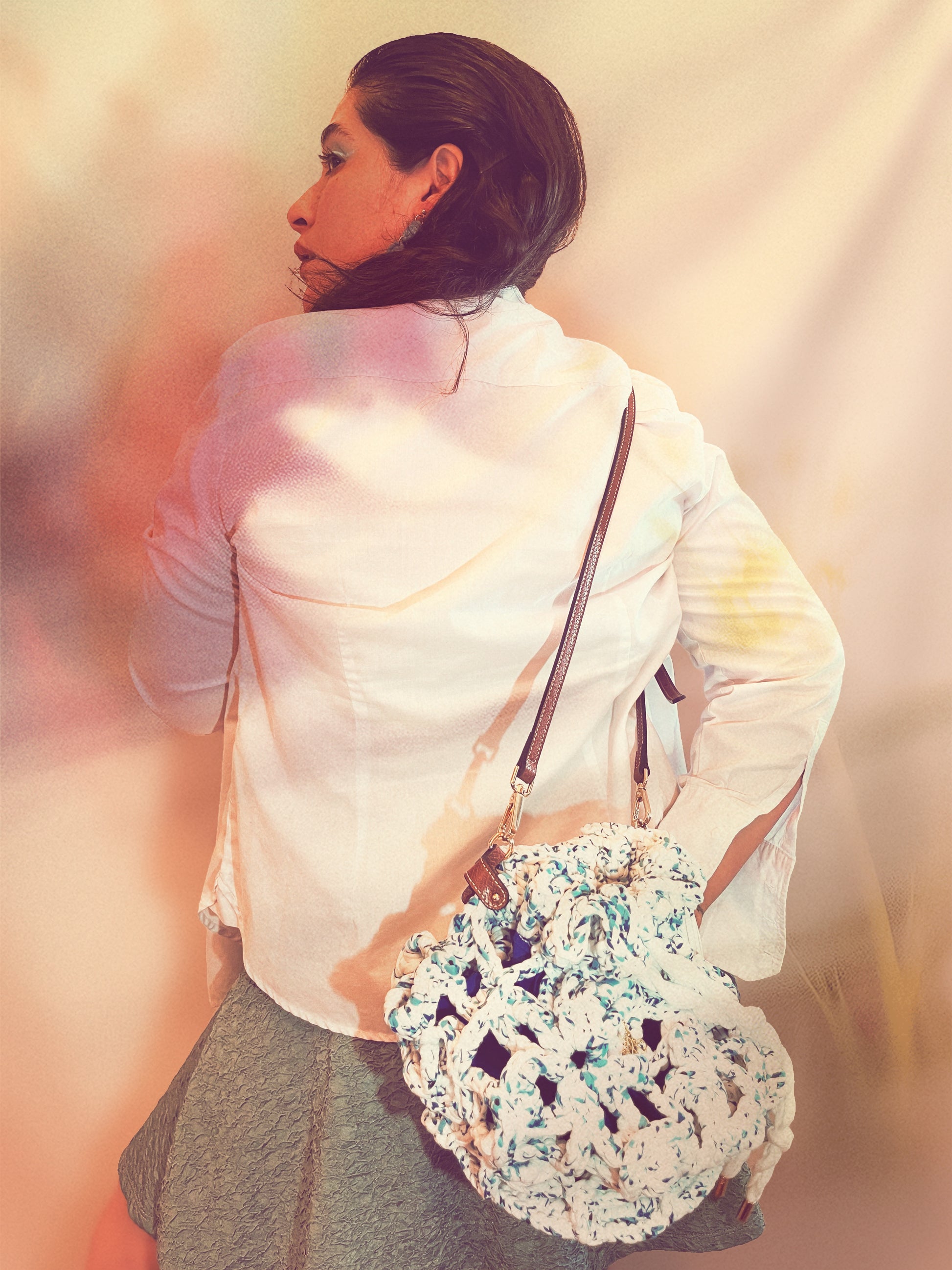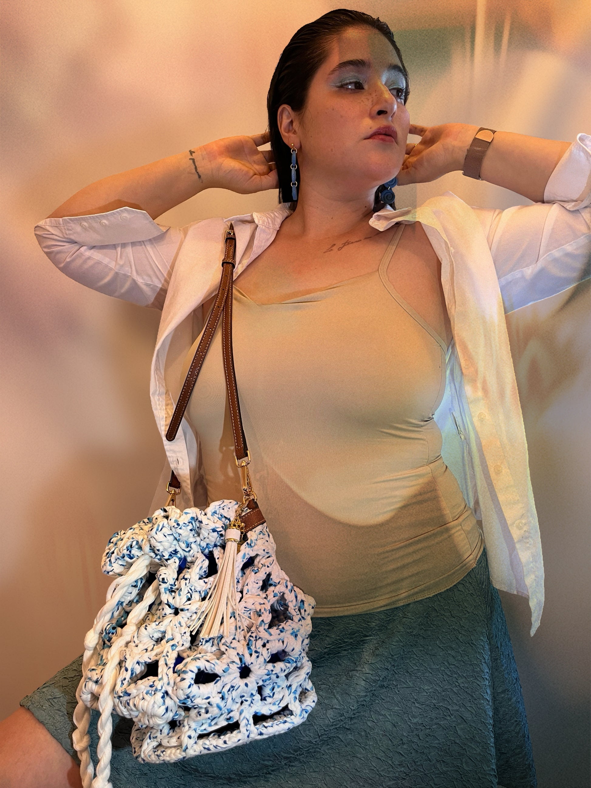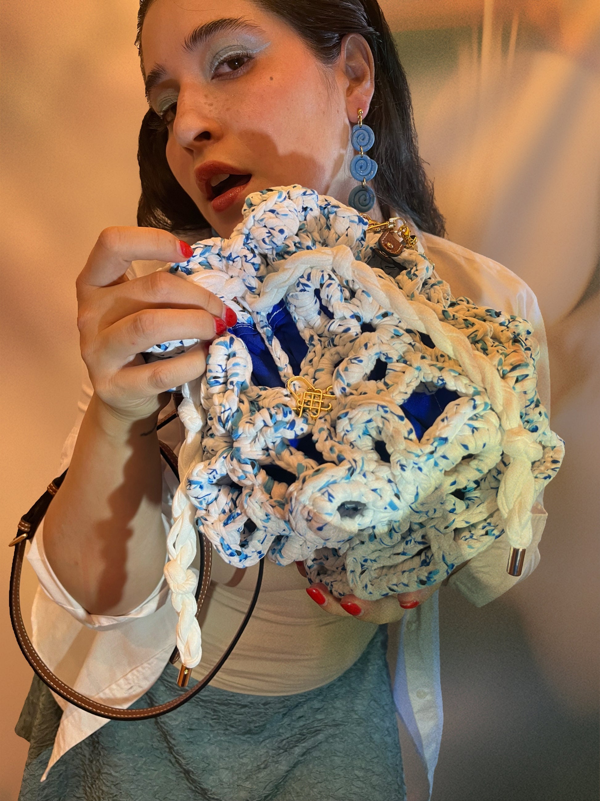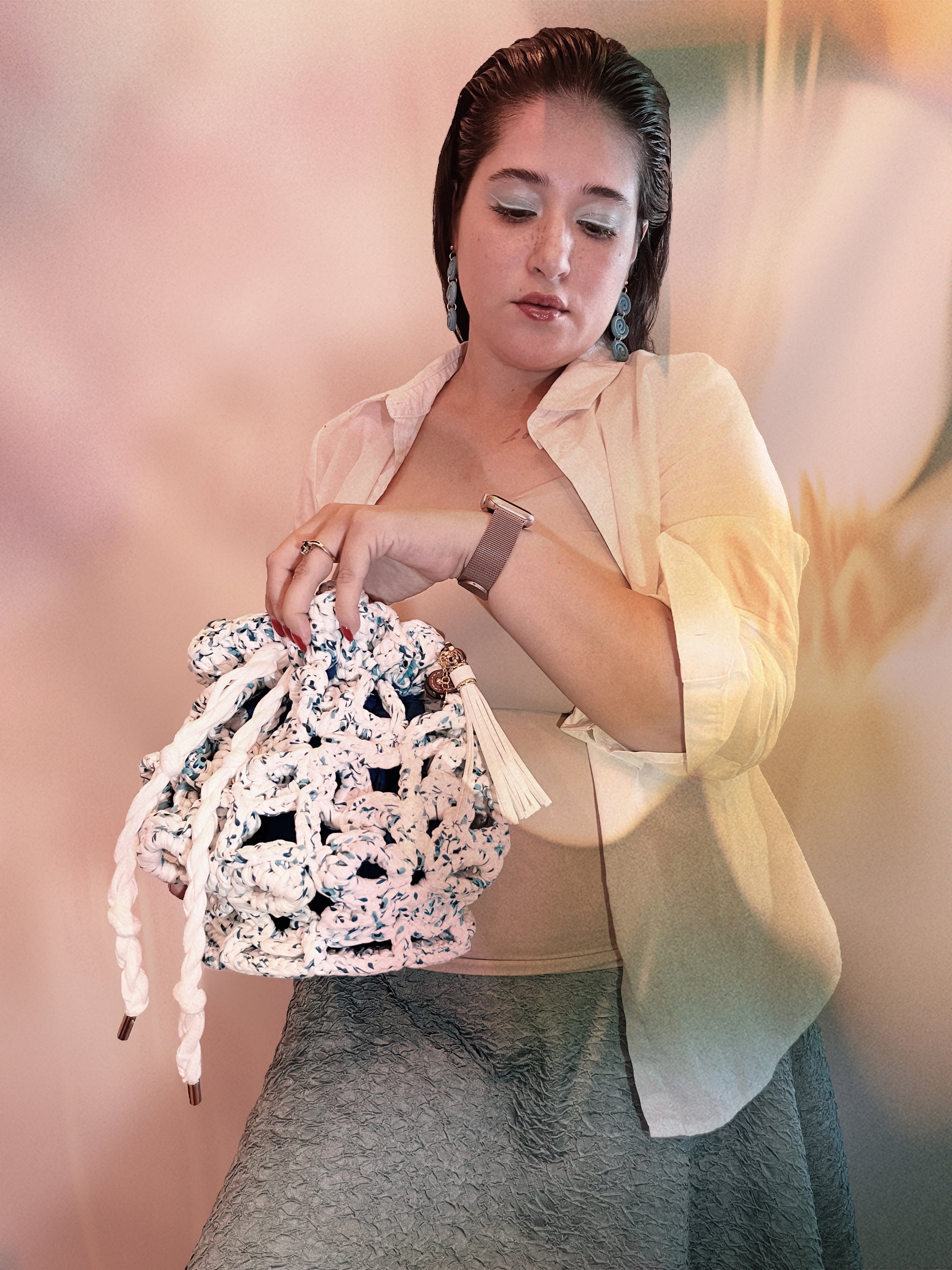 Descubre el bolso Bluet: ¡el bolso de verano definitivo de nuestra diseñadora, listo para llevar a todas partes! Perfecto para días de playa, citas de brunch con amigas o esas aventuras de ensueño en tus rincones favoritos. Este no es un bolso cubo cualquiera: con sus flores de seis pétalos cosidas en cadena, ¡es como llevar un precioso florero! Elaborado con hilo de camiseta con un divertido estampado floral, incluye una correa ajustable que puedes combinar y una bonita base de cuero sintético con pequeños pies. ¡Prepárate para llamar la atención y dar de qué hablar con esta belleza floreciente que grita diversión veraniega!