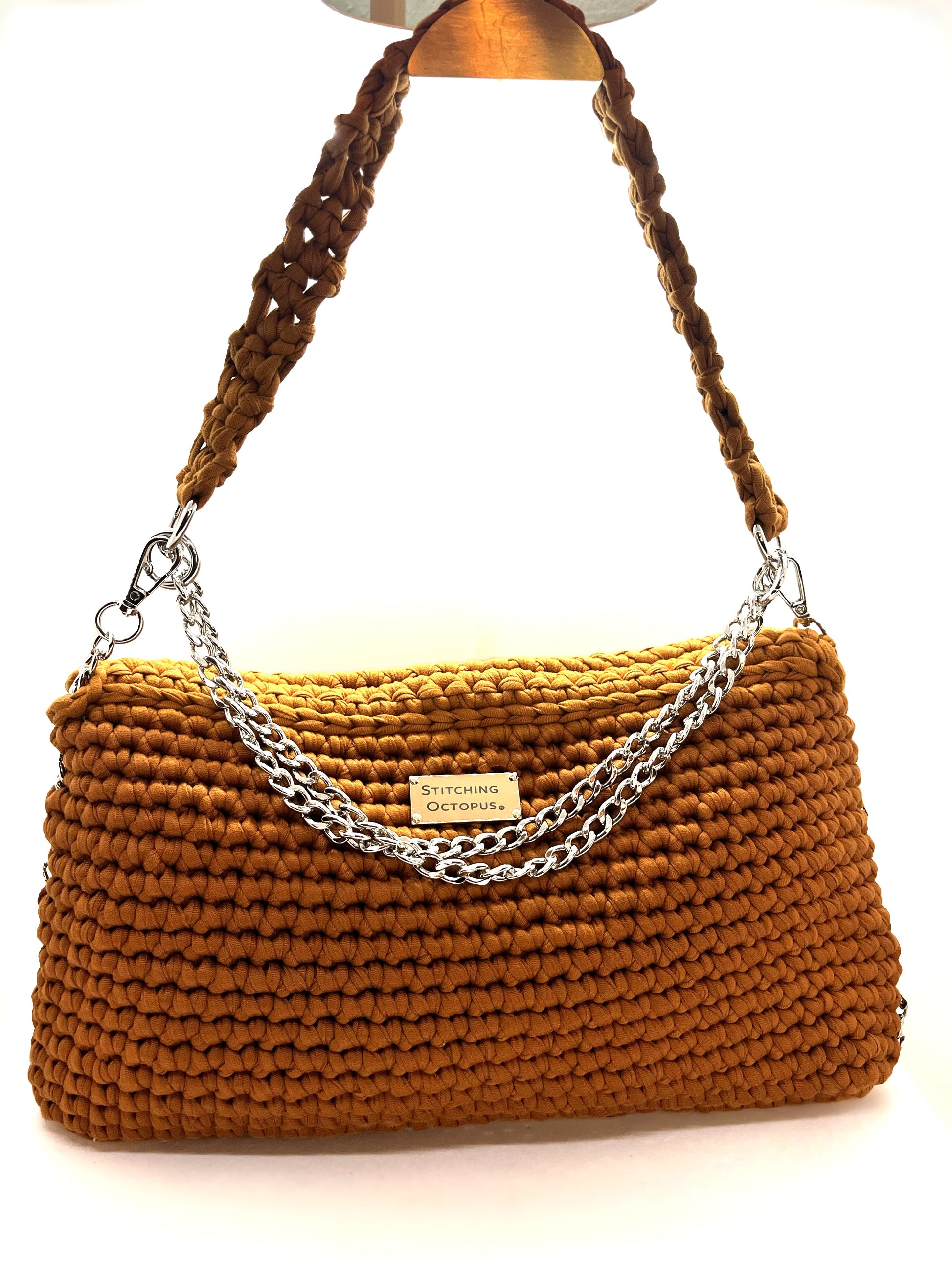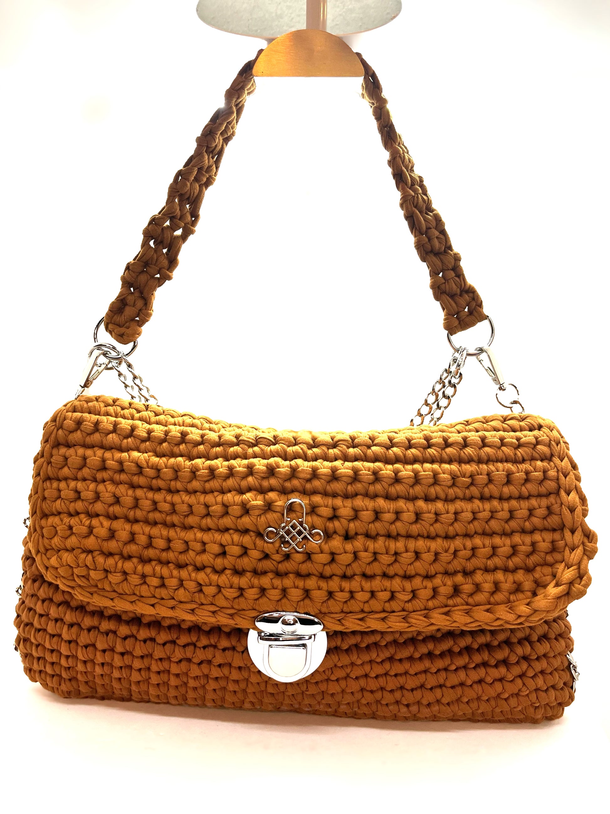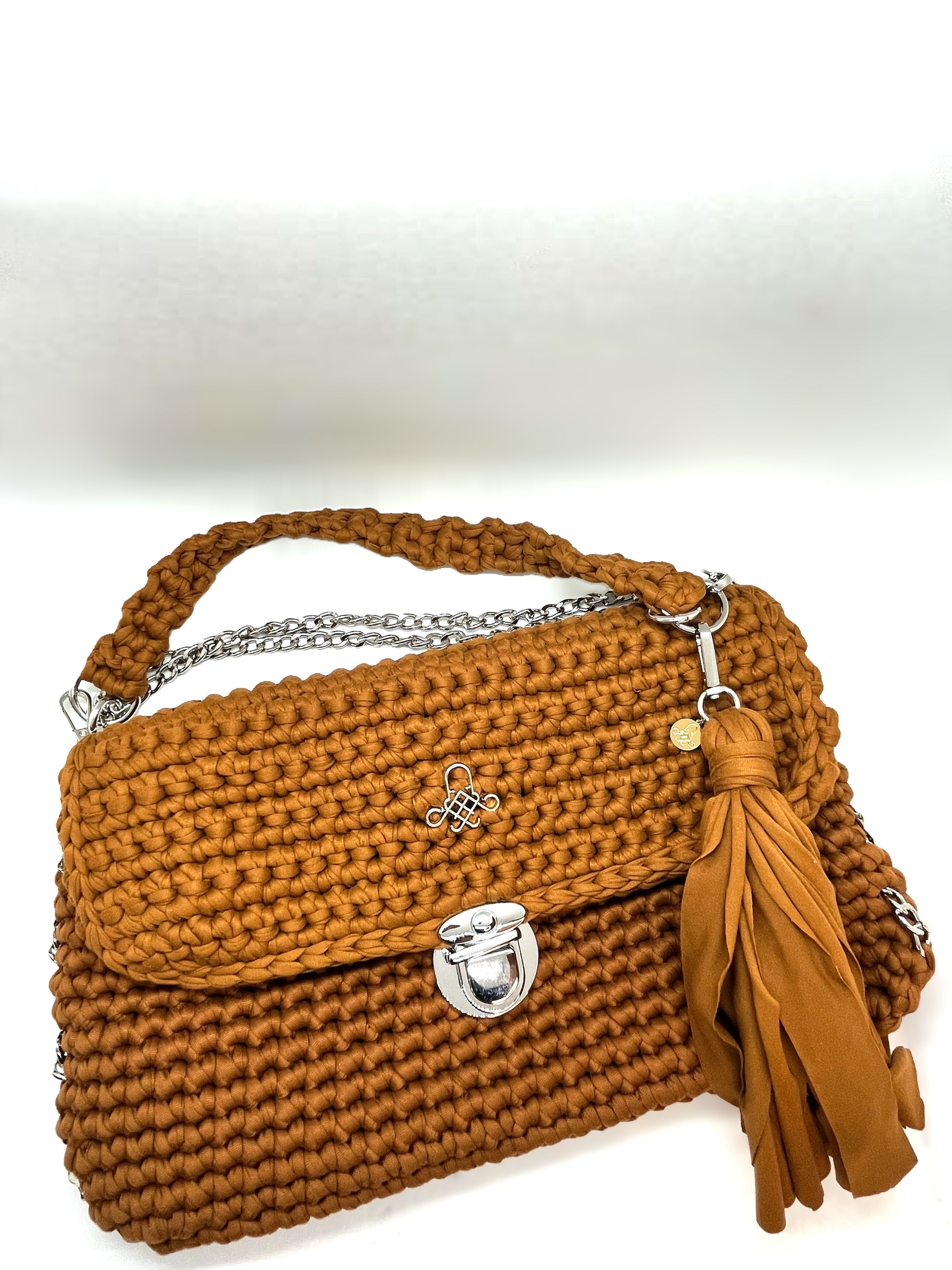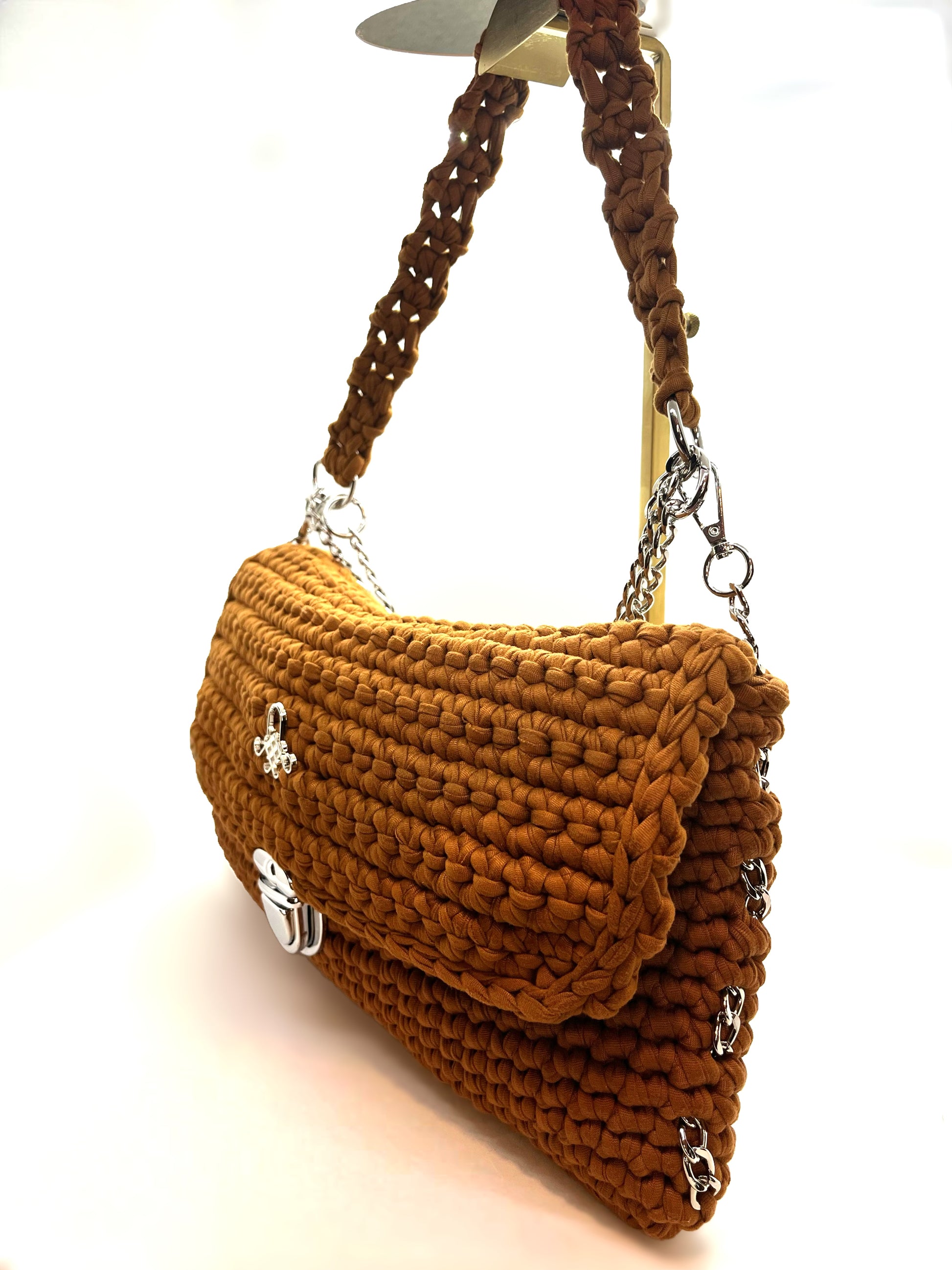 Nuestra bolsa tejida a mano está pensada para chicas con actitud rebelde, estilo audaz y un toque glam. Su textura artesanal y su diseño estructurado hacen de esta pieza el complemento perfecto para looks edgy y casuales. Ideal para llevar de día o de noche, y brillar con detalles que hablan por ti.