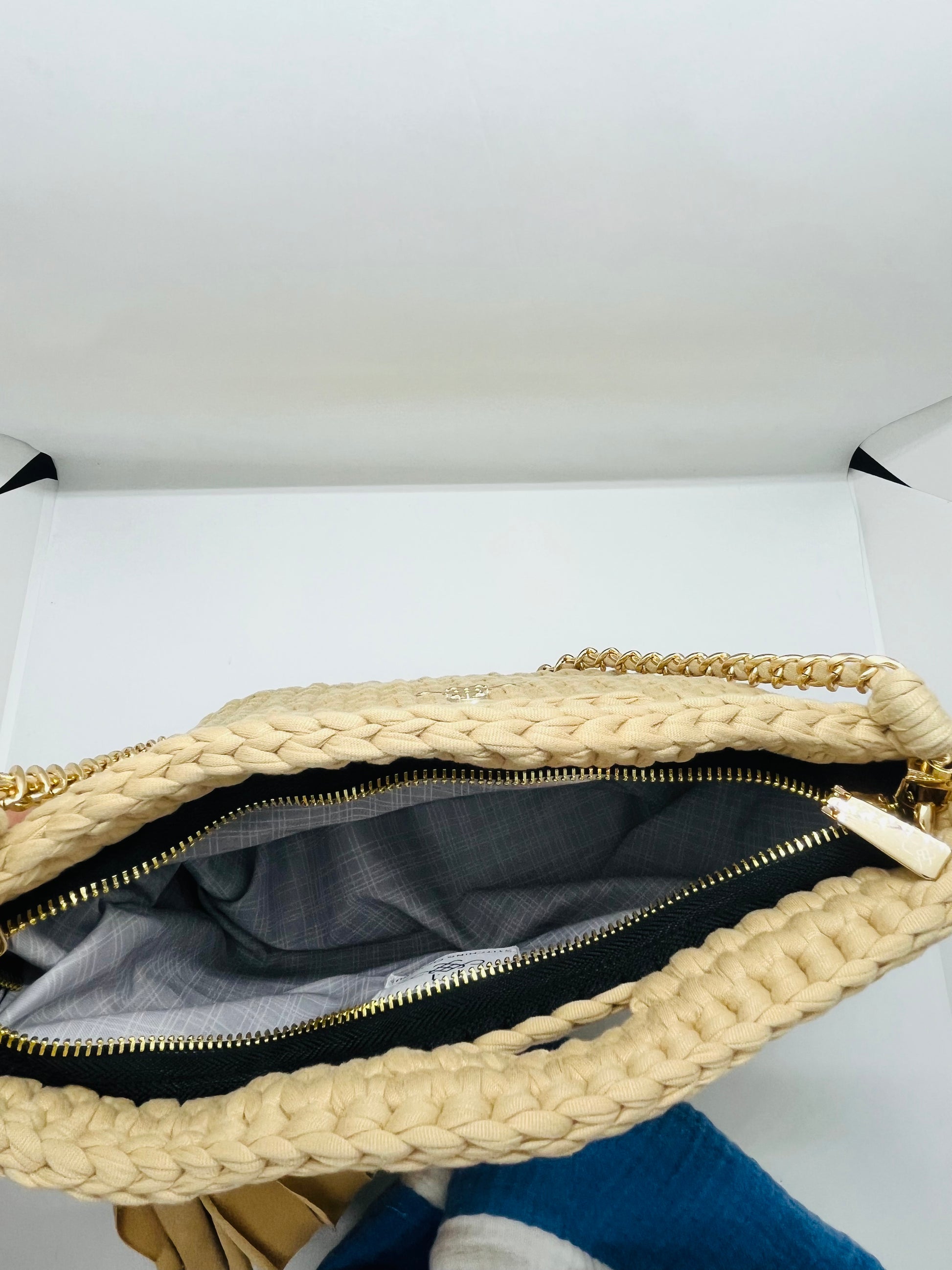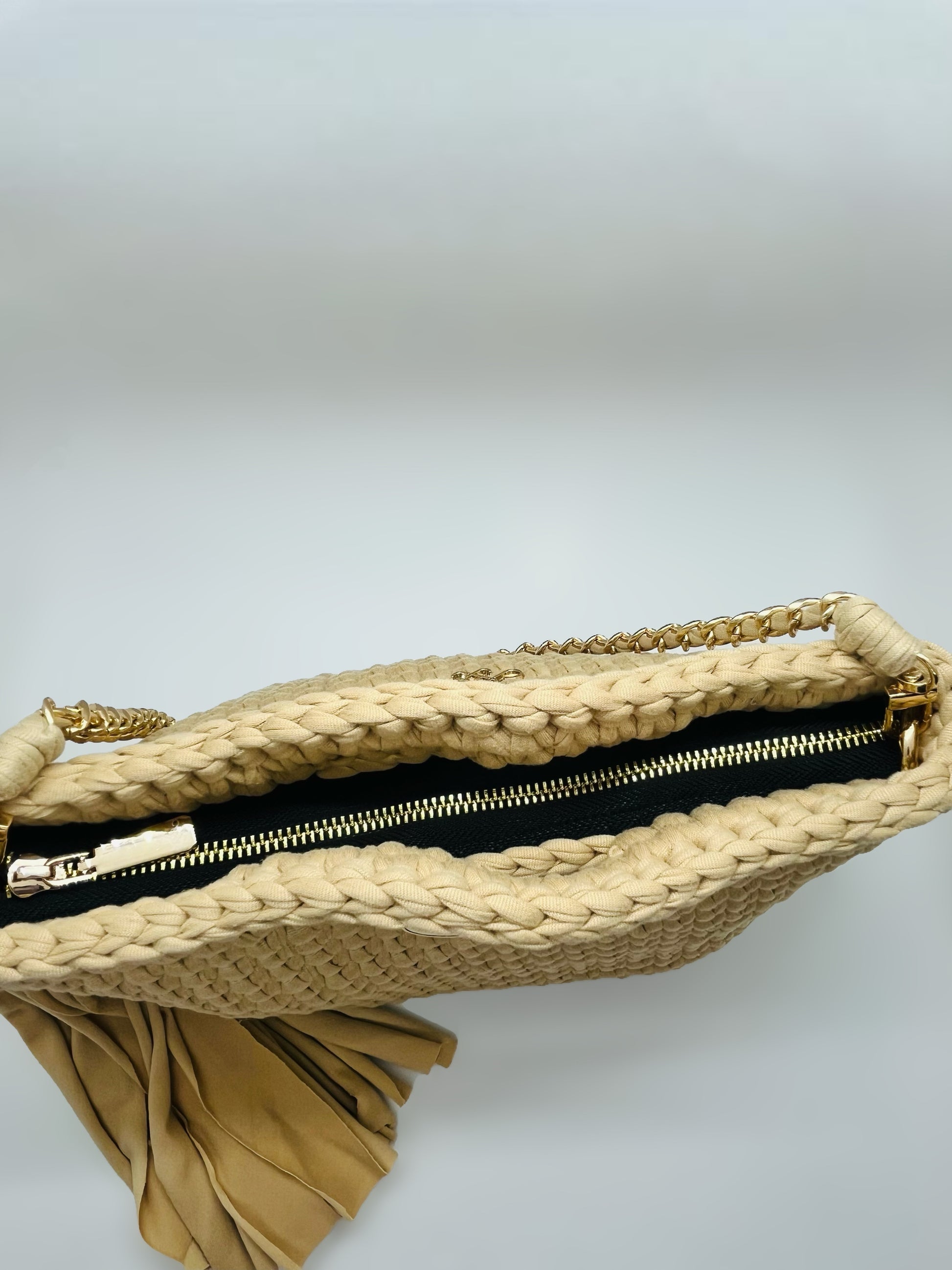 Elaborada con un asa integrada para mayor comodidad y una cadena de metal entrelazada que añade un aire sofisticado y moderno. Como detalle especial, incluye una borla hecha a mano con un dije bañado en chapa de oro de 18K, reflejando su exclusividad.
