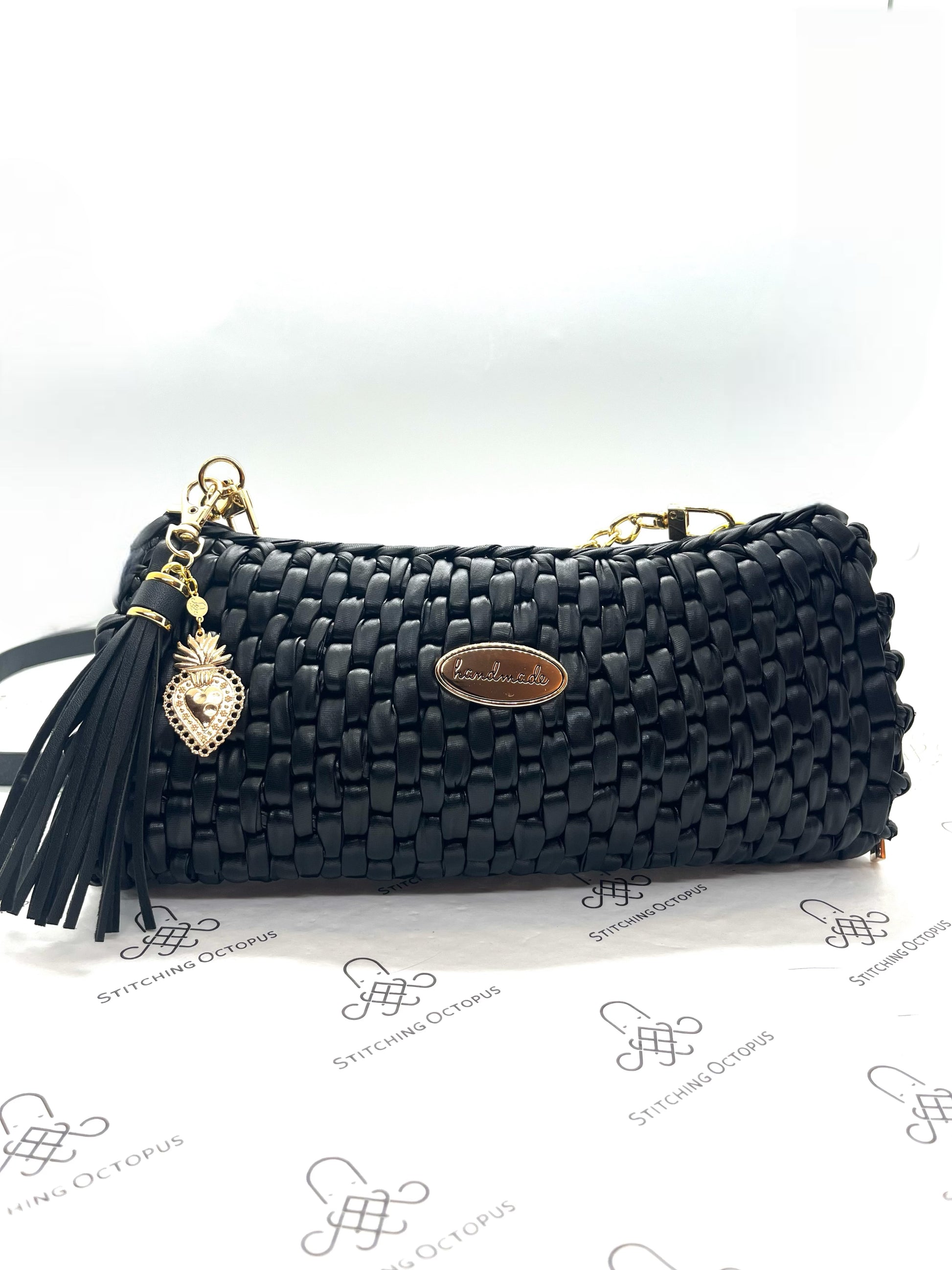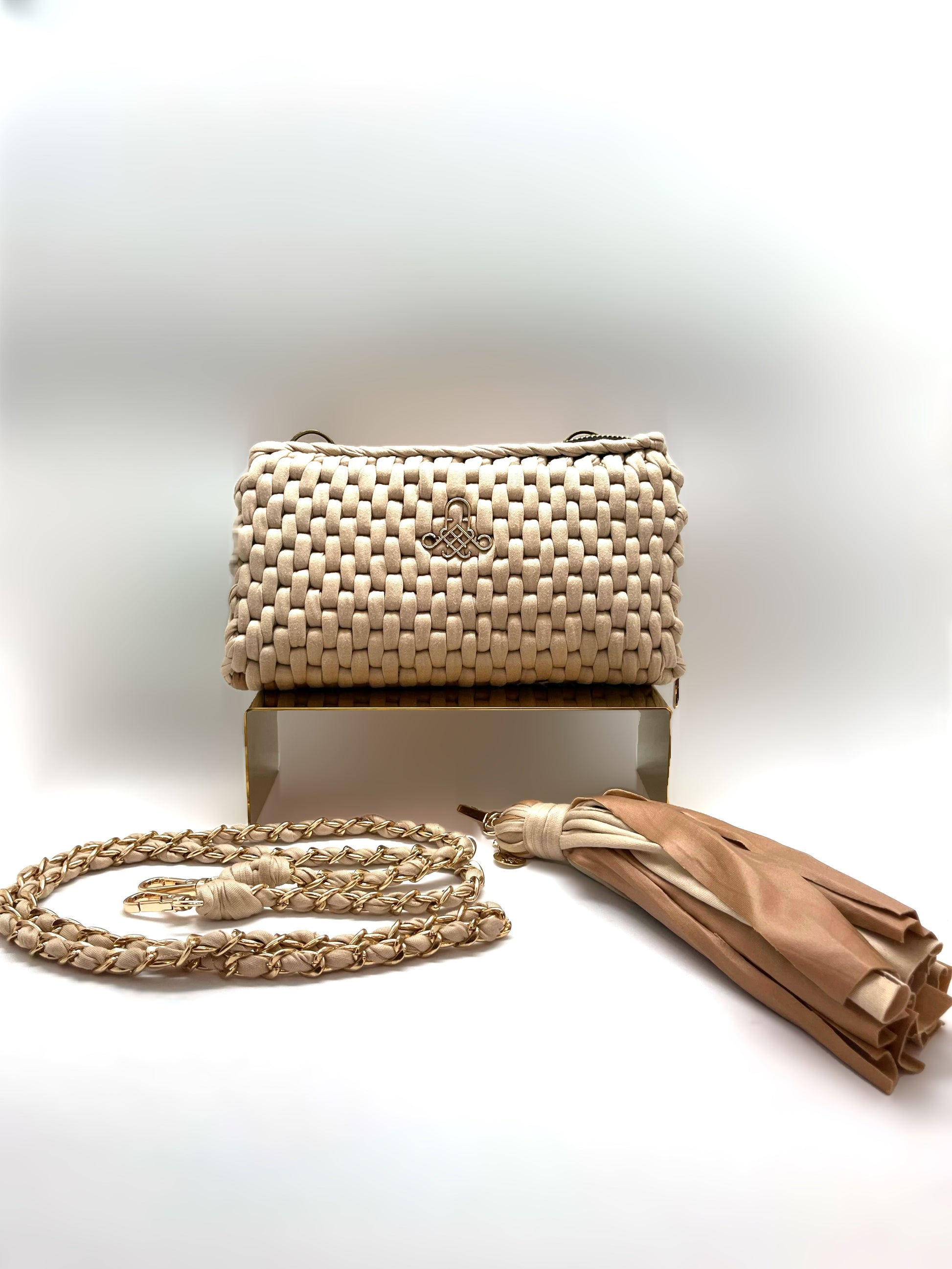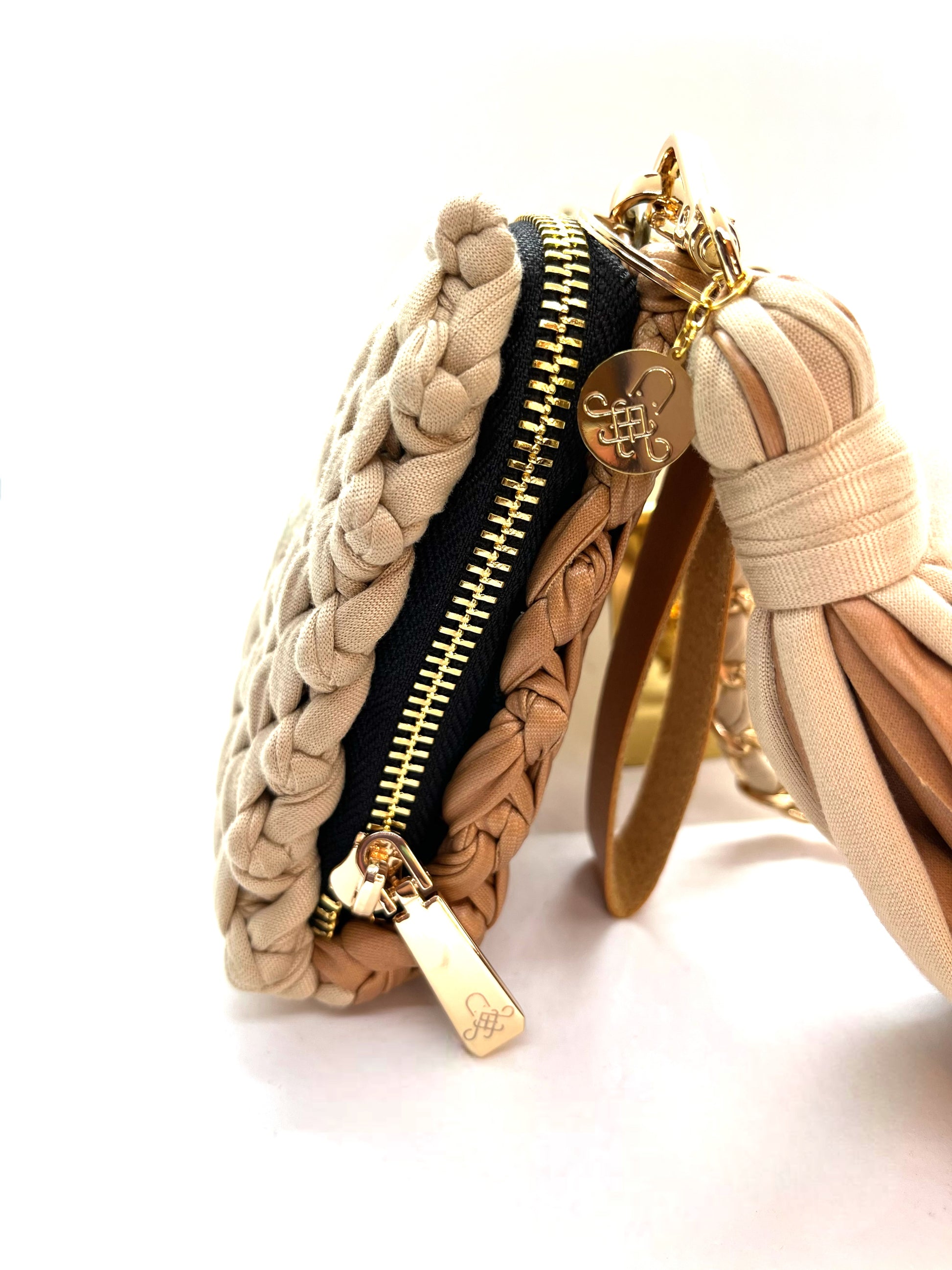 Atrévete a ser versátil con esta cartera/bolsa con la que no necesitaras traer nada más que tus pertenencias personales en un solo espacio, sin necesidad de traer bolsas dentro de tu bolsa. Hecha con trapillo de tela, herrajes de zinc aluminio y su respectiva etiqueta bañada en oro de 18k que lleva en la borla.
