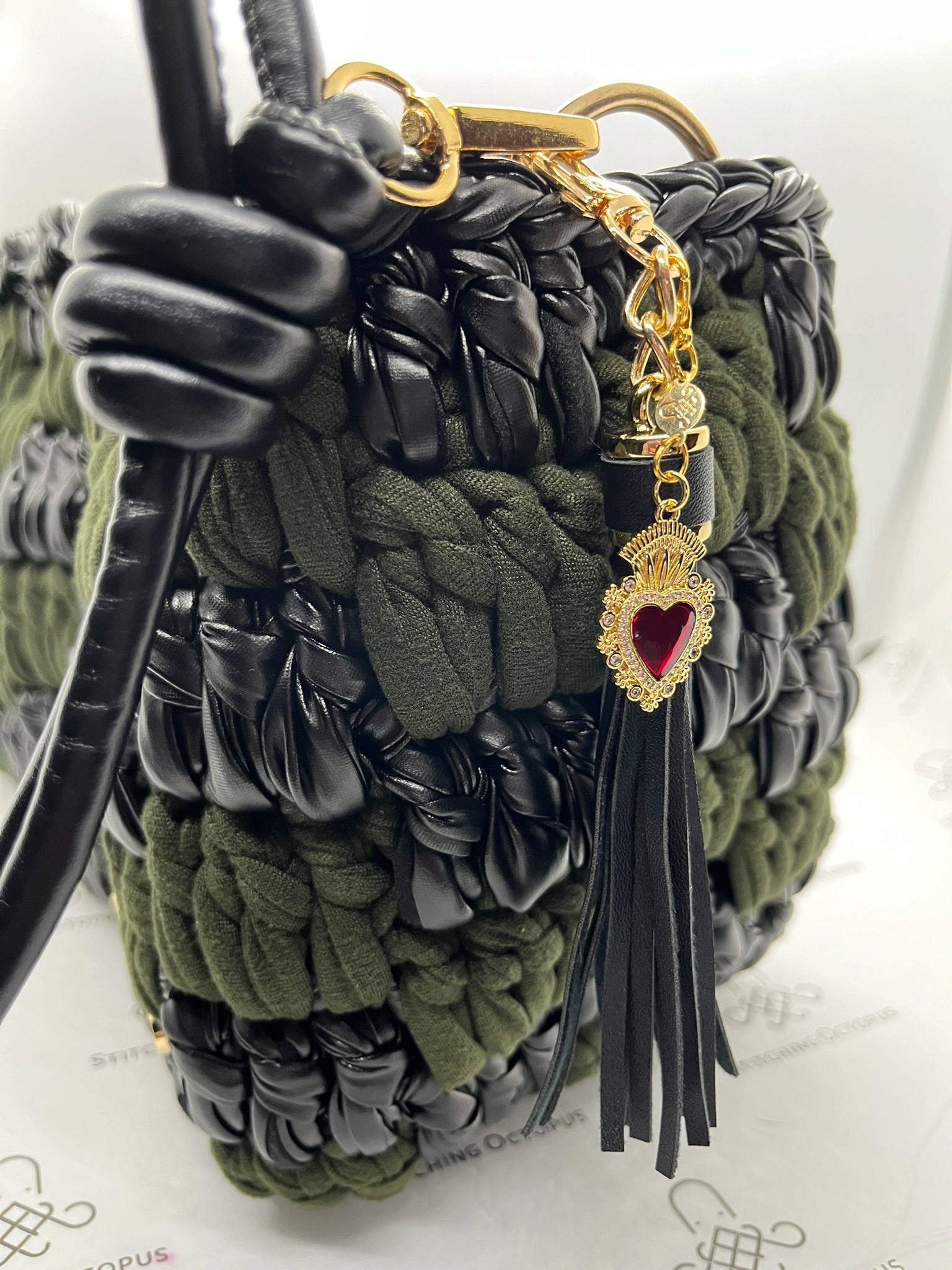 Una borla de cuero sintético que también lleva nuestro dije del logo bañado en chapa de oro de 18k. También cuenta con un strap ajustable para usarse en el hombro o de crossbody.